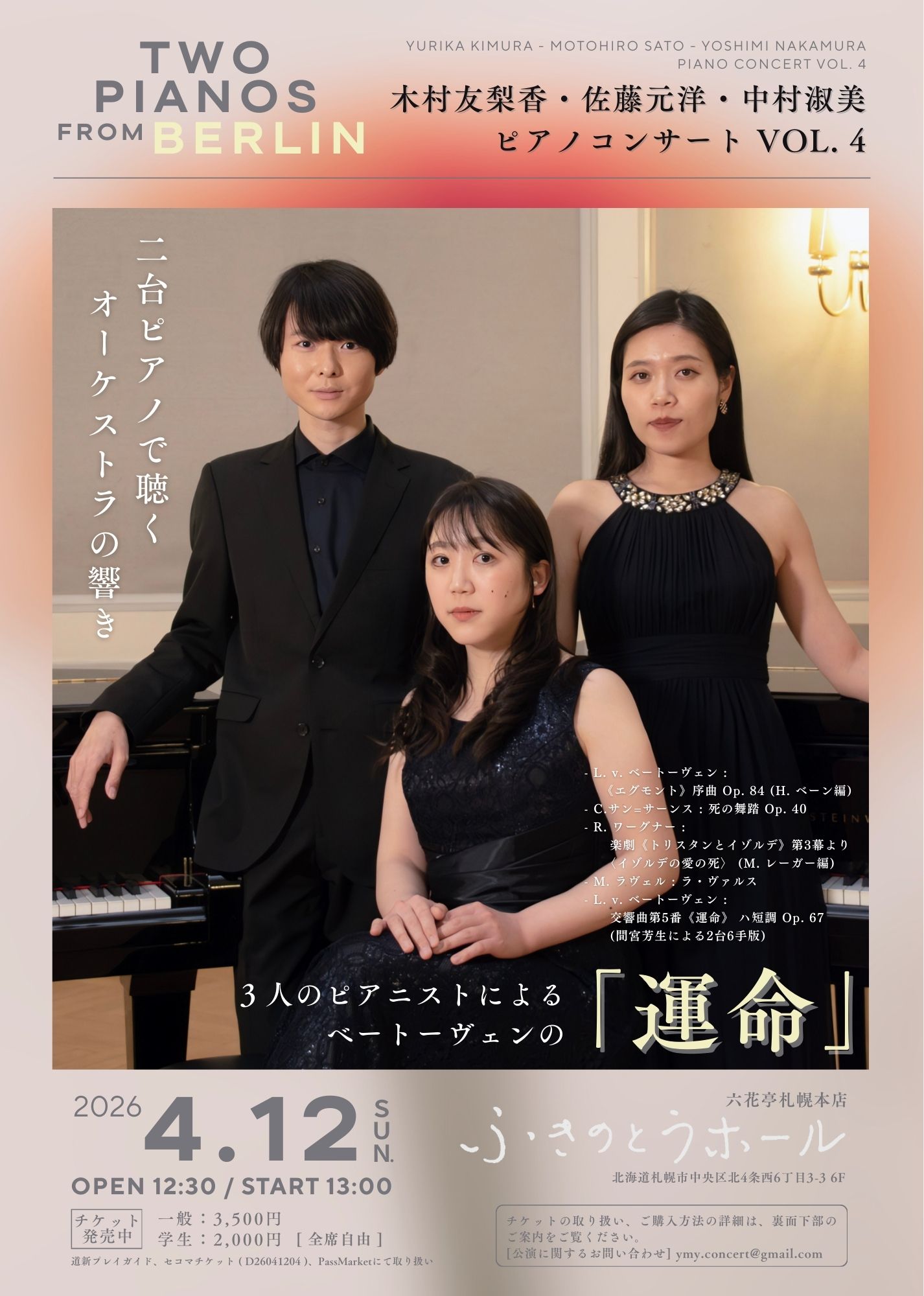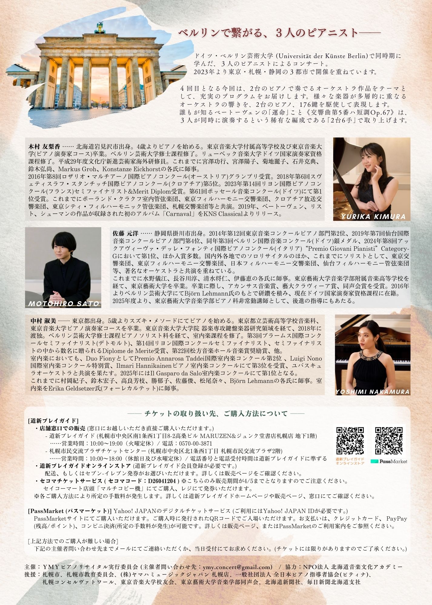ベルリン芸術大学(Universität der Künste Berlin)で同時期に学んだ3人のピアニストによるコンサート。2023年より毎年夏の公演として、東京・札幌・静岡にて開催を重ねています。昨年に続き、今回も2台ピアノによる華やかな協演をお届けします。2台のピアノの豊かな響きから生まれる、ドイツ・フランス・ロシアの音世界をお楽しみください。